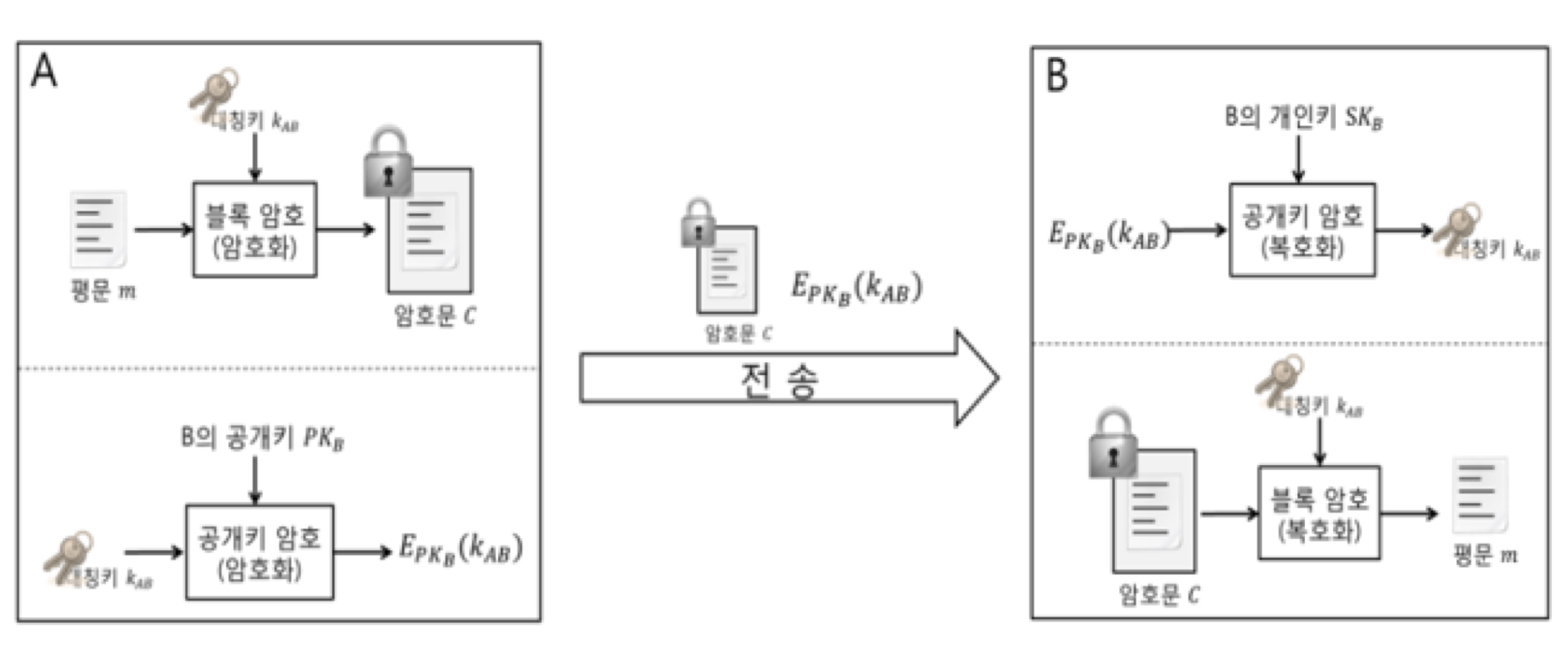 => A가 보내고자 하는 평문을 대칭키로 암호화 - A의 대칭키를 B의 공개키로 암호화 - 이 2개를 같이 보냄 - A의 대칭키를 B의 개인키로 복호화 - 복호화로 얻은 A의 대칭키로 암호화된 평문을 복호화