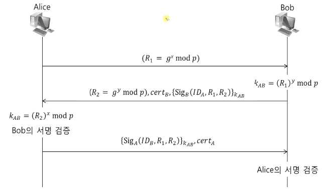 이와 더불어, 단순히 <Diffie-Hellman 키 교환 프로토콜> 로만 키 교환을 하면 중간에 공격자가 Alice인 척(혹은 Bob인 척) 가능.
