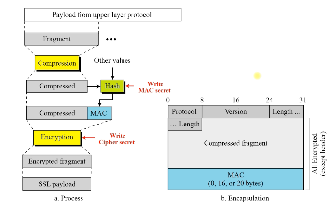 : 암호화 통신을 함. 데이터를 압축하고 이를 MAC 키를 통해 Hash함수에서 MAC(Message Authentication Code)값을 뒤에 붙여줌. 이후 이를 Encryption(암호화)하고 그 값을 전송함.