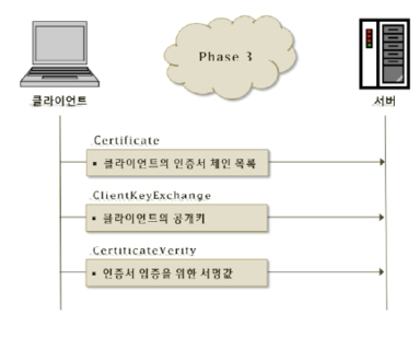 : 클라이언트의 인증서, 공개키, 서명값을 보내줌.