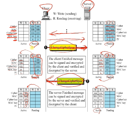 pending(보류)상태에 있는 값들을 트리거인 ChangeCipherSpec을 통해 active로 모두 옮겨지면 그때부터 암호화 통신을 할 수 있음.