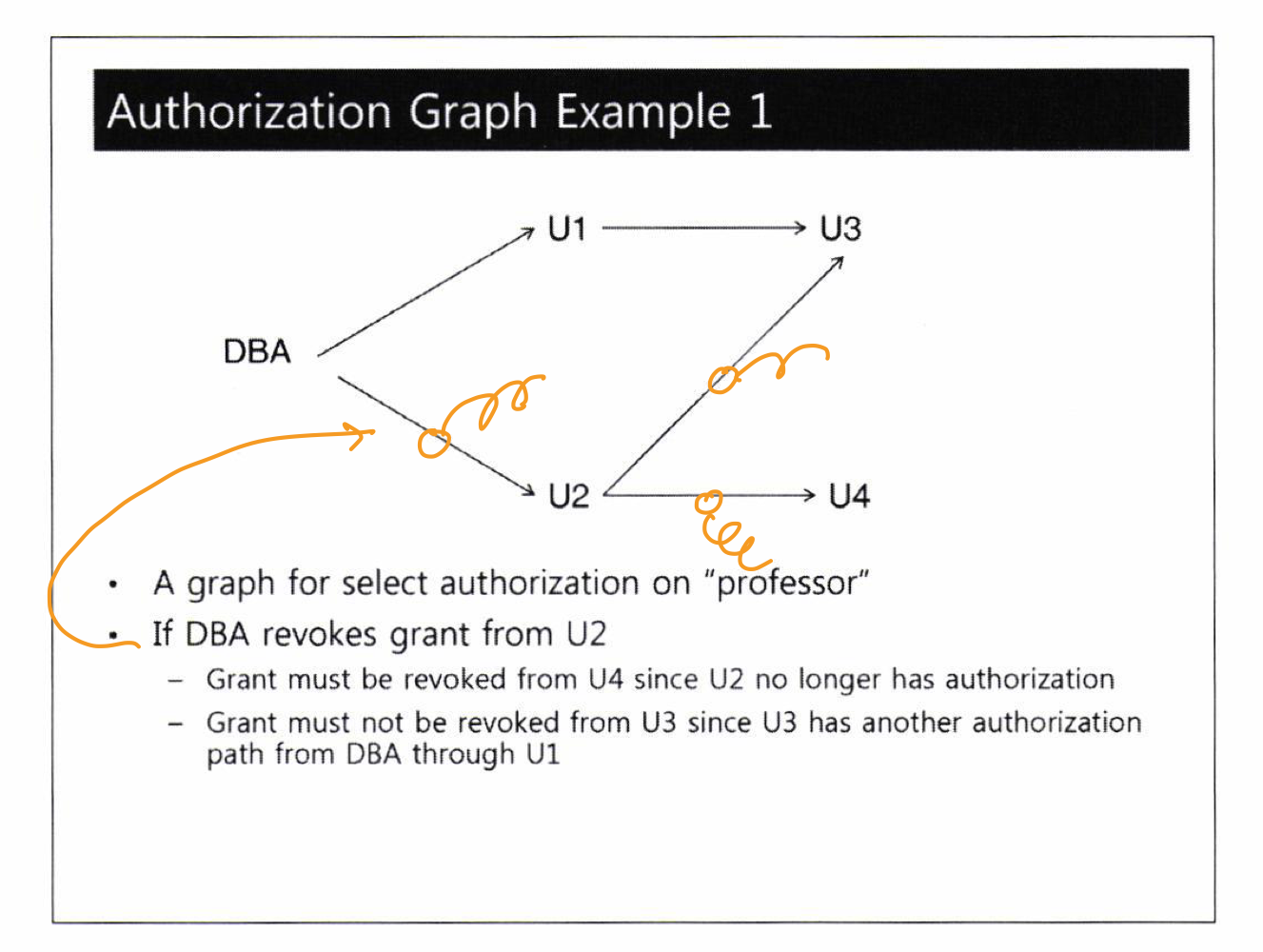 - 사용자는 DB 연산하려면 연산에 필요한 권한(Authorization)을 가져야 함.