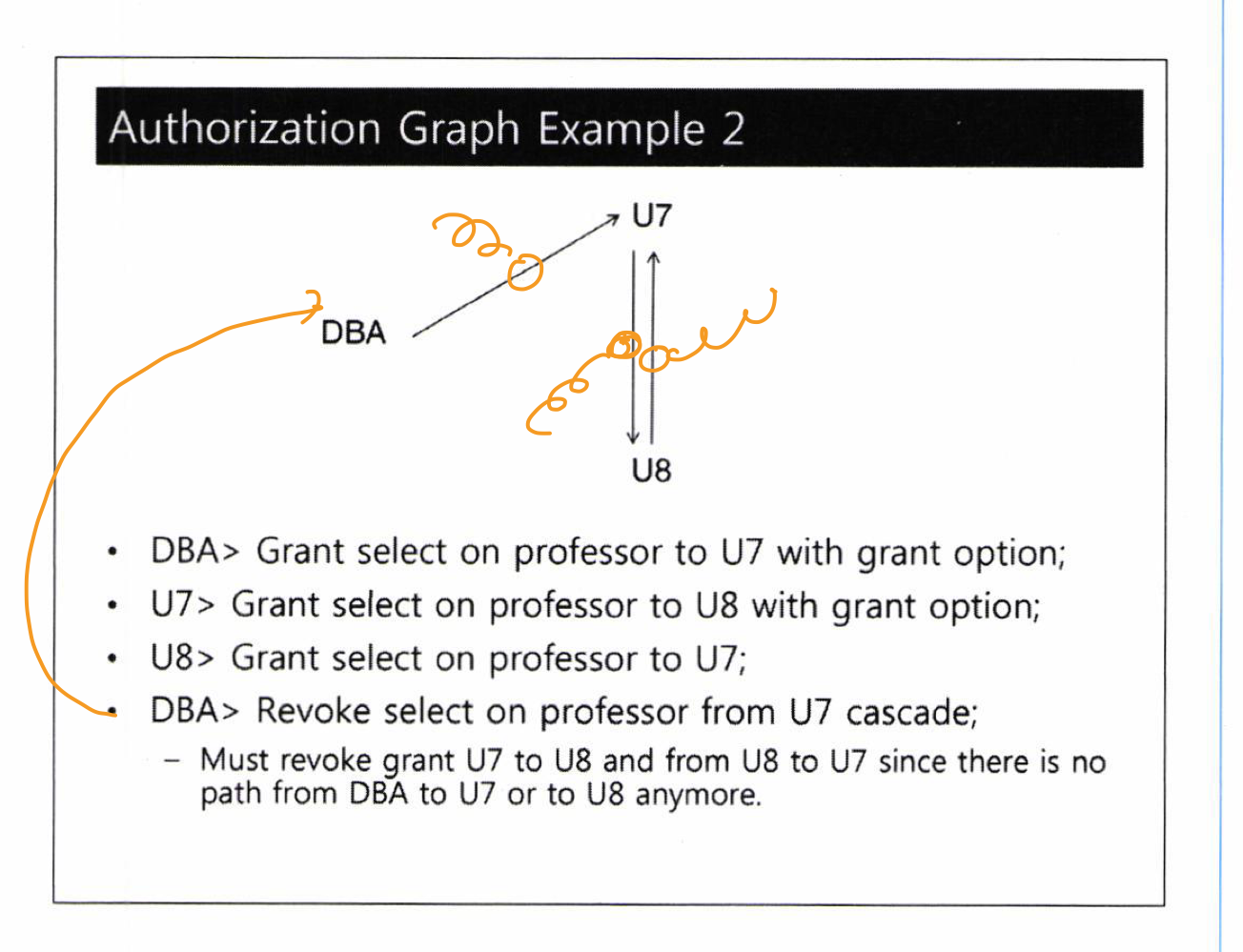 Grant select on professor to U4 with grant option; //U4는 다른 사용자에게 해당 권한을 부여할 수 있음.