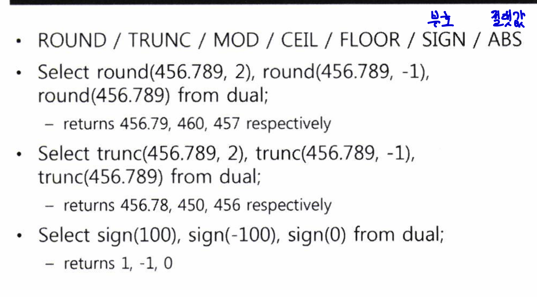 - dual 테이블 : 컬럼이 1개, 터플이 1개인 독특한 테이블로 sys가 소유 중임.