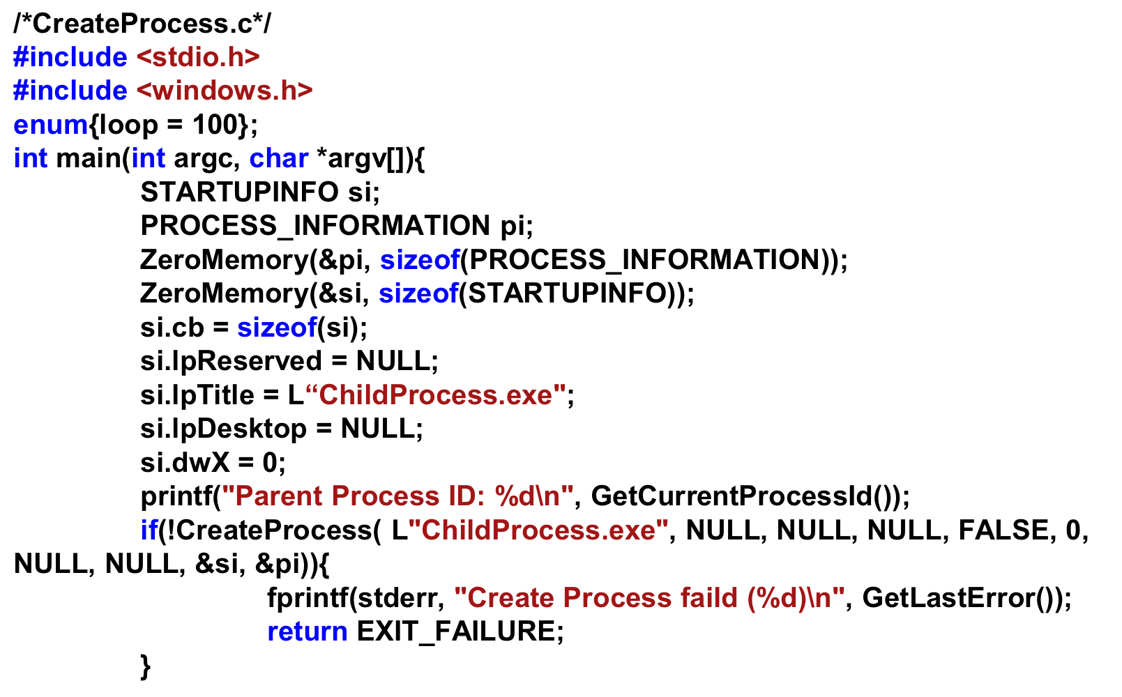 - CreateProcess()를 통해 자식 프로세스를 생성함.(이때 이 함수는 True or False를 리턴함.)