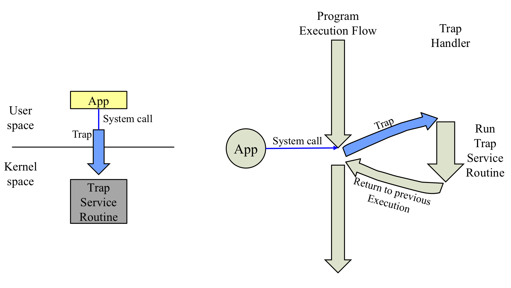 - ISR처럼 Trap Service Routine(TSR)이 있음. 하지만 Interrupt와 달이 실행 State를 저장 및 복원하지 않음.