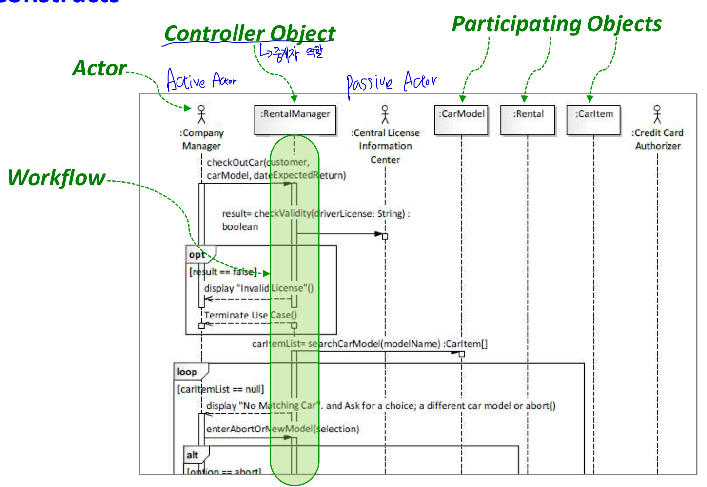 - 시퀀스 다이어그램은 Active Actor, Controller Object, Passive Actor, Participating Objects로 구성된다.