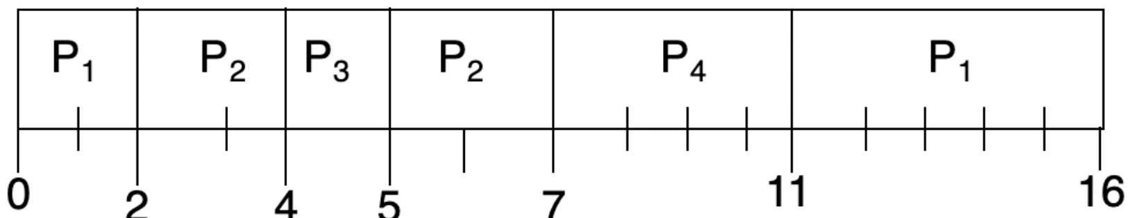 : Time Quantum(시간 단위, 보통 10-100ms임)을 정해두고 그만큼 수행 후 Ready Queue의 끝에 넣어두고 다음 프로세스로 넘기는 방식으로 순회한다