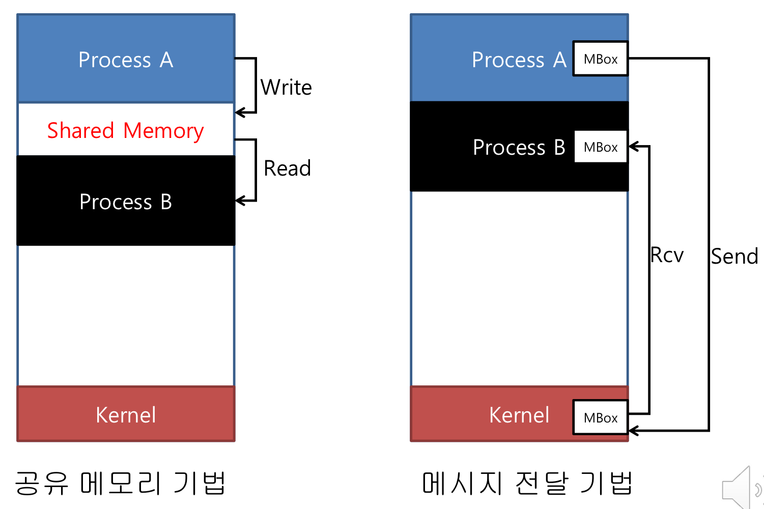 두 방식의 큰 차이점: OS(커널)를 거쳐서 메시지를 전송해야 하느냐와 공유 메모리를 두고 read/write만 해서도 데이터를 주고받을 수 있느냐의 차이.