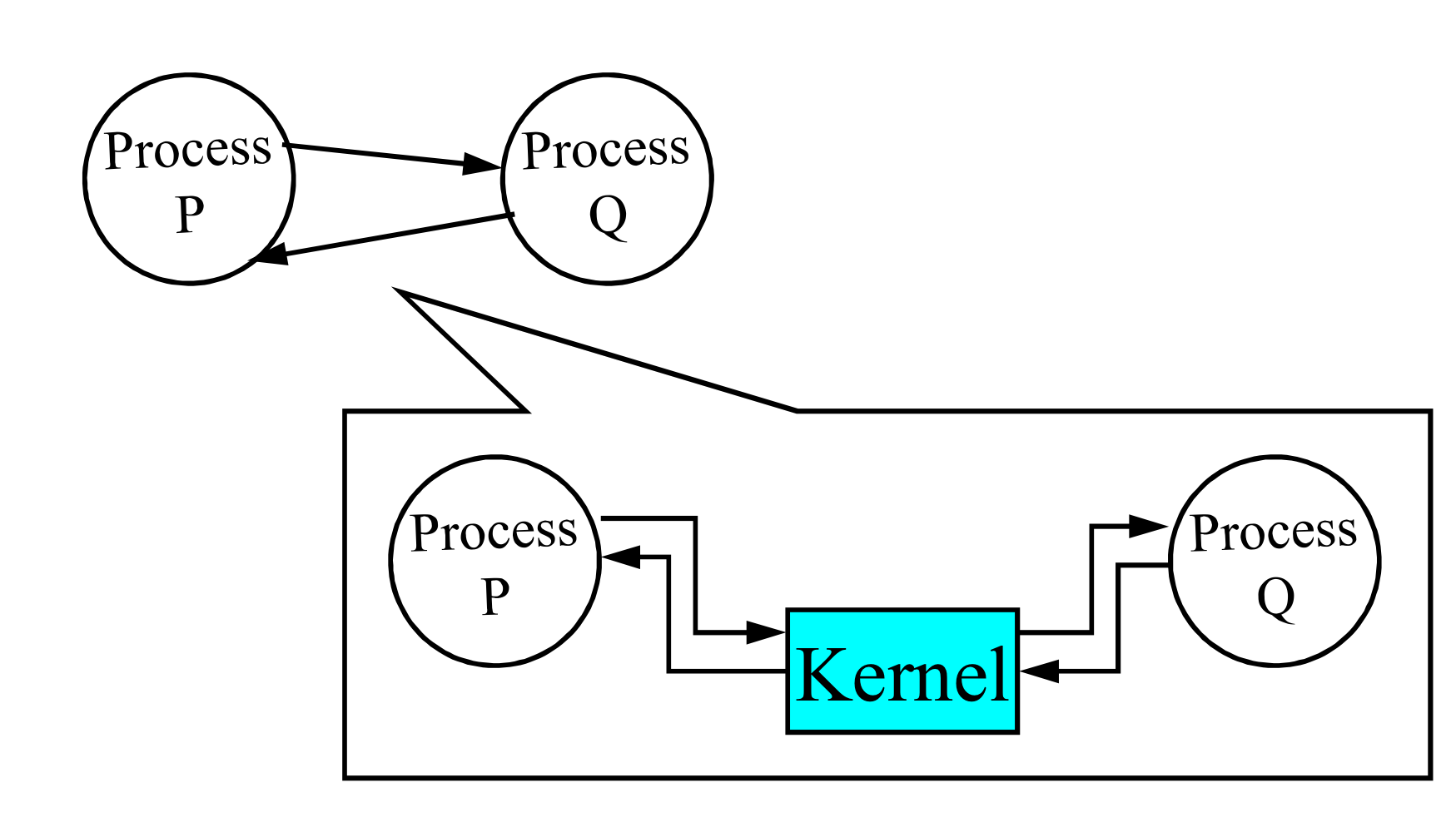 -> 커널을 통해 메시지를 전송함. 때로는 커널에 데이터를 버퍼링 되어 있다가(커널이 갖고 있다가) 프로세스에 전달됨.