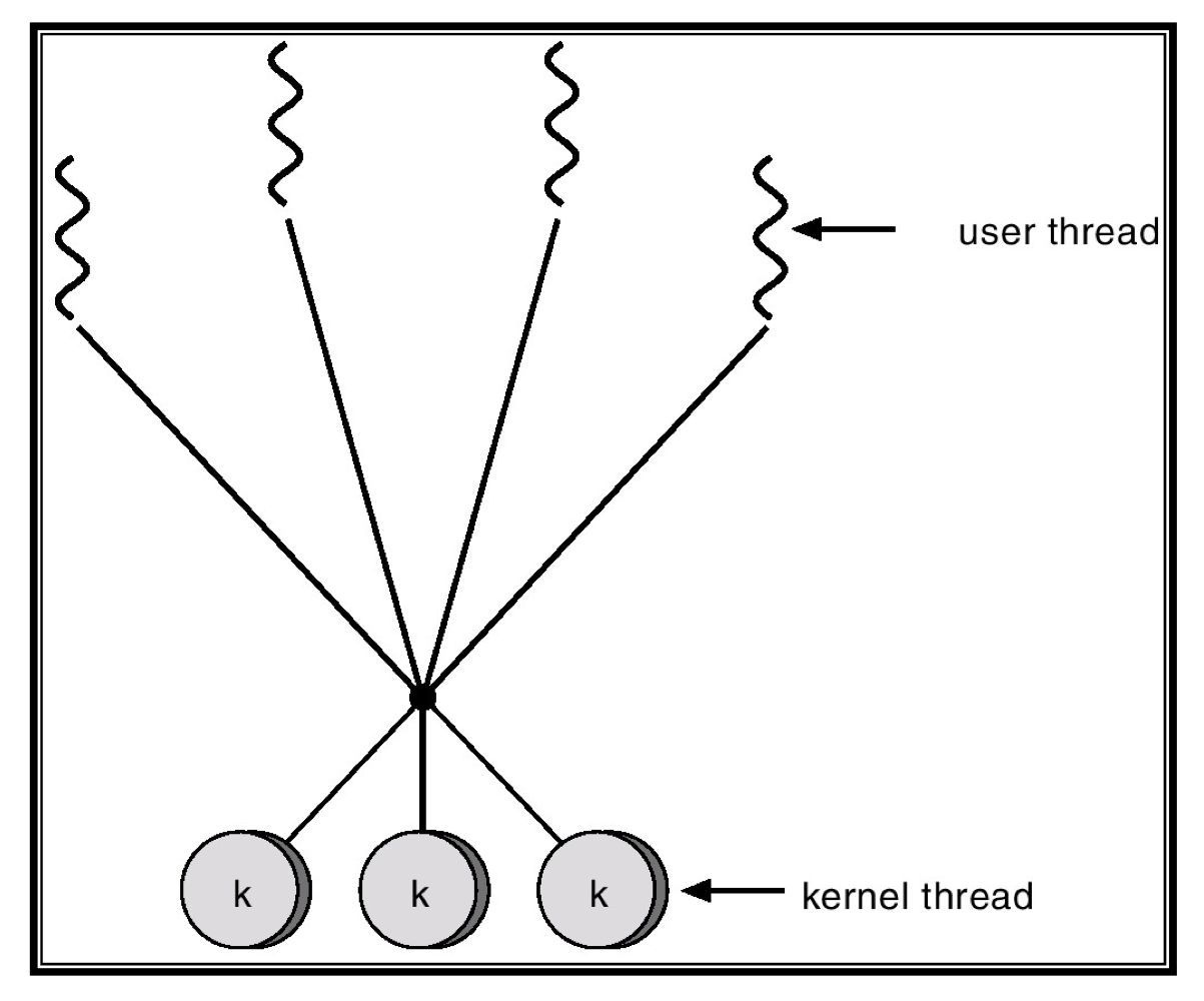 : 여러 User Thread를 여러 개의 Kernel Thread로 Mapping하는 것. Kerneal Thread는 User Thread 개수보다 적거나 같은 만큼만 생성되어 적절히 스케줄링됨.