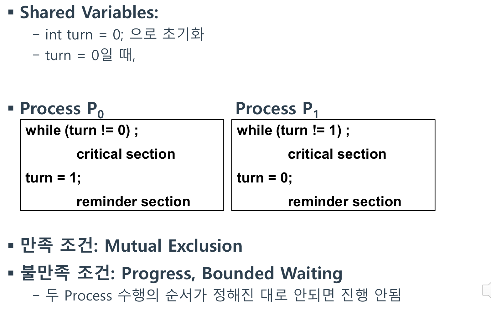 P0 -> P1이면 해당 알고리즘은 만족하겠지만, 두 프로세스의 수행 순서가 바뀌면 진행이 안되고 무한정 대기해야 하는 경우가 생김.