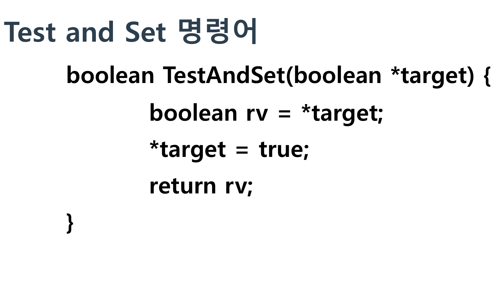 -> Test and Set은 인자로 들어온 값을 True로 바꿔주고 들어왔던 값을 return해주는 역할을 함.