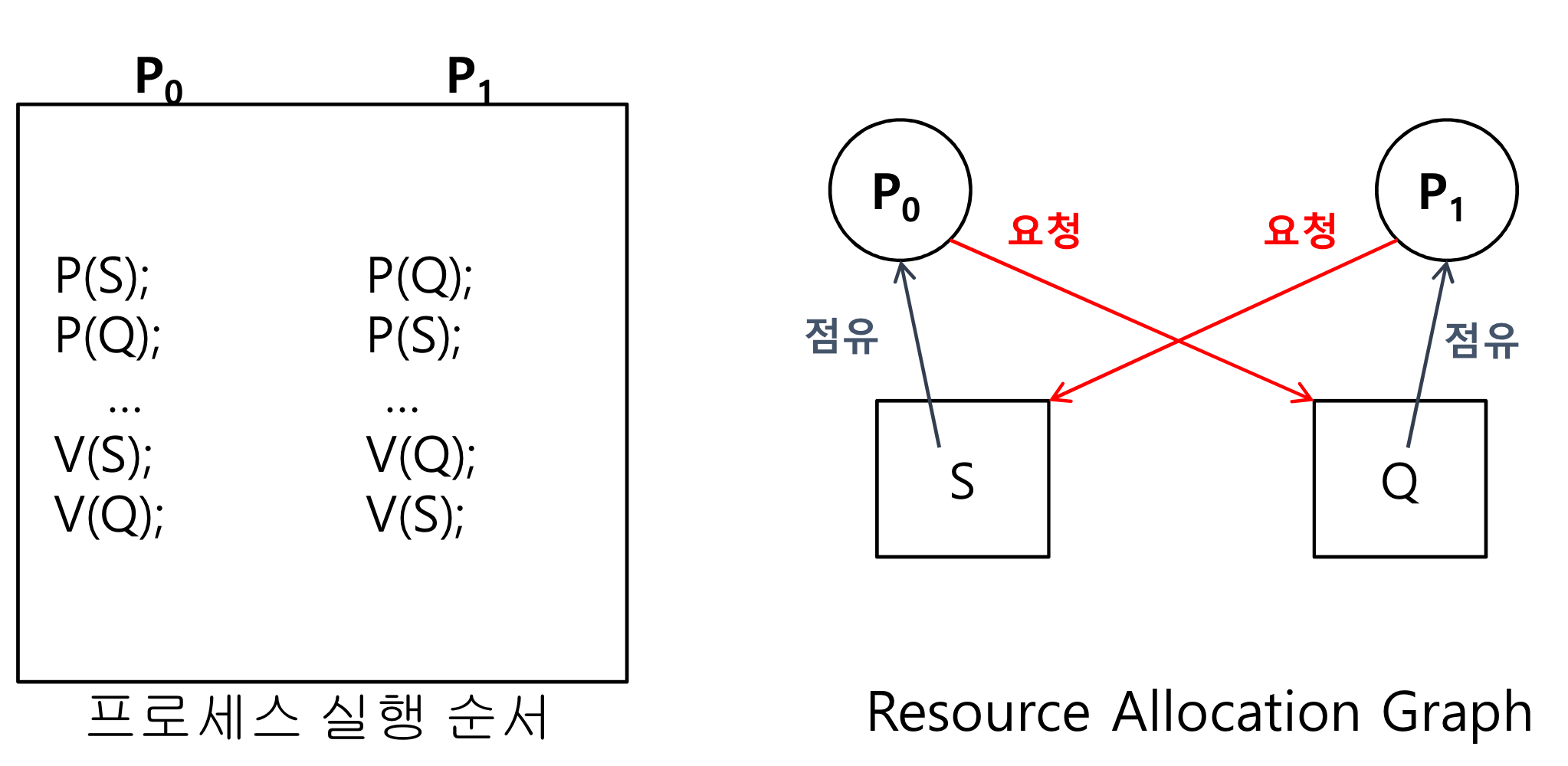 P0가 S를 가져가고 P1이 Q를 가져간 상태 - P0에서 Q를 가져가려는데 아직 P1에서 풀어주질 않음, P1에서 S를 가져가려는데 아직 P0에서 풀어주질 않음 - 무한 대기