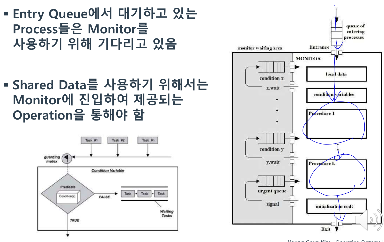 (세마포어 중 멀티 쓰레드 커널에선 커널 내에서의 동기화도 해야 하므로 P,V를 잘 사용해야 함. 즉, Deadlock을 방지하기 위한 책임이 프로그래머에게 있음. 근데 모니터는 따로 동기화 해결이 필요가 없으니까 얼마나 편하냐~~!?~~!?)