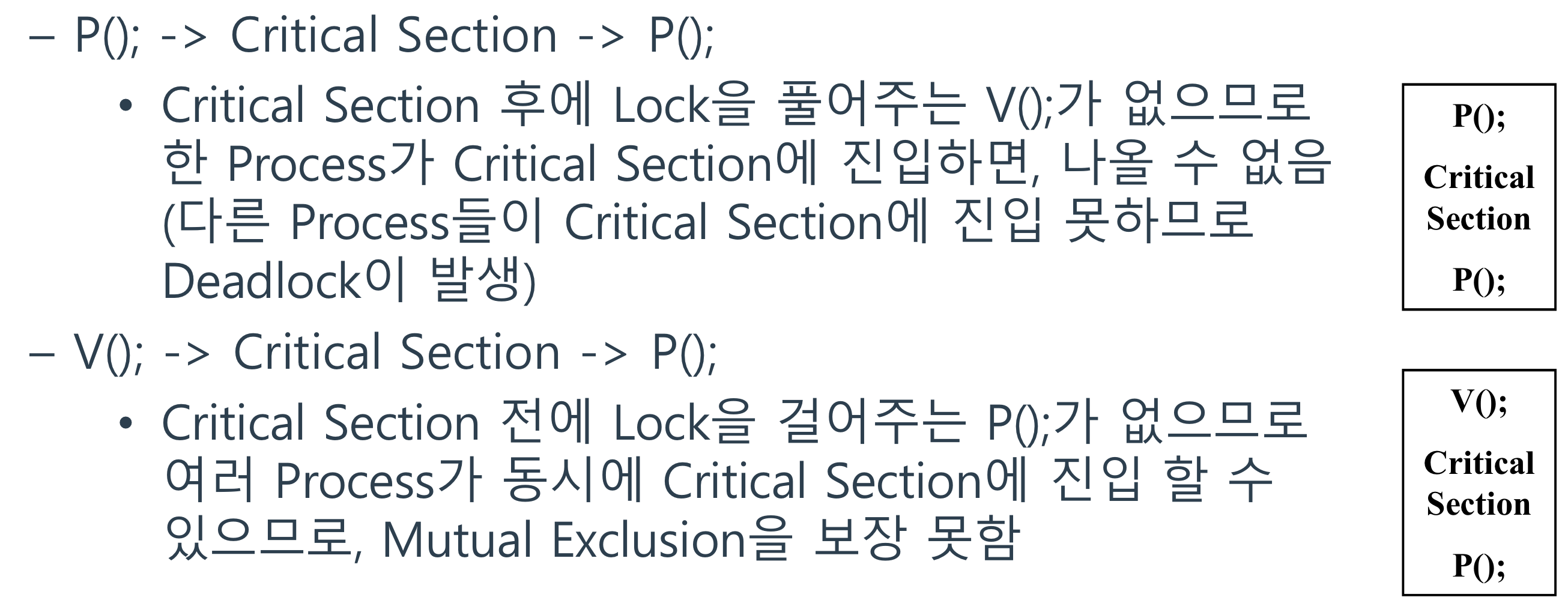 2) P와 V의 연산이 분리되어 있기에 잘못 사용 시에 대책이 없음.