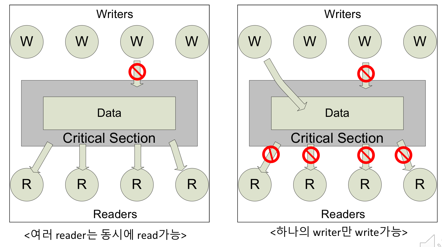 : 여러 Readers와 Writers가 하나의 공유 데이터를 읽거나 쓰기 위해 접근함.