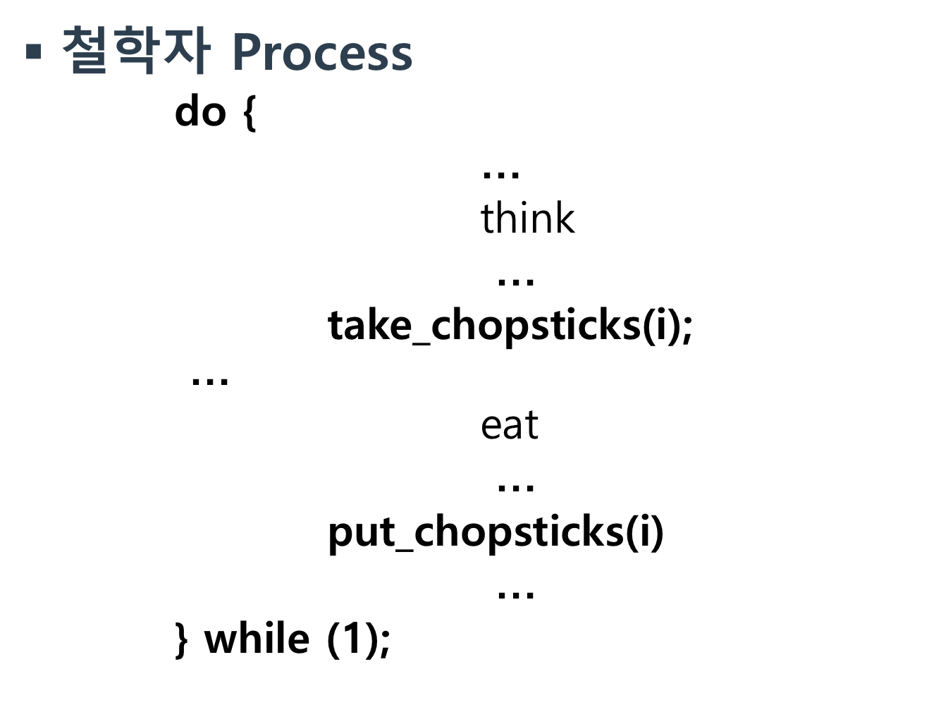 -> 일단 각 철학자는 프로세스를 do-while문으로 계속 도는데 일단 thinking 중임. 그러다가 take_chopsticks를 통해 젓가락 집어보려고 함. 집으면 eat하고 다 먹으면 put_chopsticks로 내려둠. 그걸 반복할 거임.