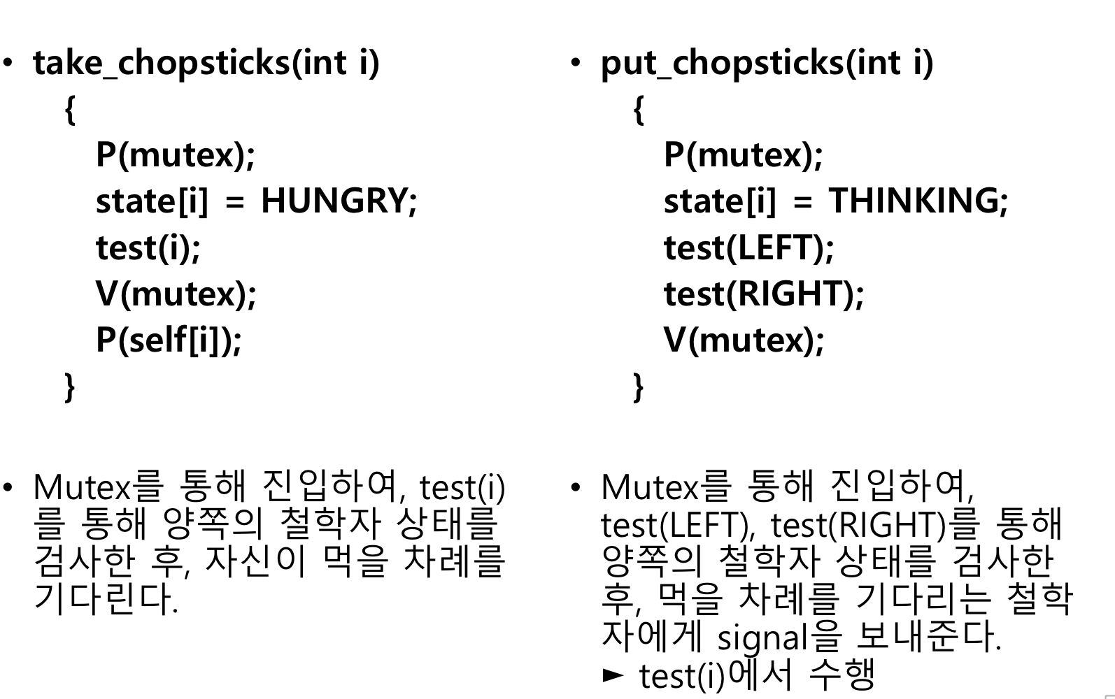 만약 나 지금 배고픈데 양 옆이 다 뭐 안먹는 중이네..?? 바로 나 EATING으로 바꾸고 0이던 self[i]를 V를 통해 1 증가시킴. 그러고 test 나와서 mutex 풀어주고 P(self[i])로 self[i] 0으로 만들고 take_chopsticks 빠져나와서 eat...eat...eat함. 아 배불띠~~한 후엔 바로 put_chopsticks에서 내려놓을 타이밍 각(mutex가 1이 되는 타이밍~)잼. 각 나오면 내 상태 EATING에서 THINKING으로 바꿔주고 test(i-1)해줌. (LEFT가 i-1임.) test(i+1)도 해줌. 얘네는 내가 다 먹고나서 "양쪽 놈들이 나때문에...밥을 못먹었겠지..?ㅠㅠ"하면서 검사하고 밥 먹기 허용해주려고 test해주는 것임. 그거 끝나면 나 mutex 내려놓고 끝남.