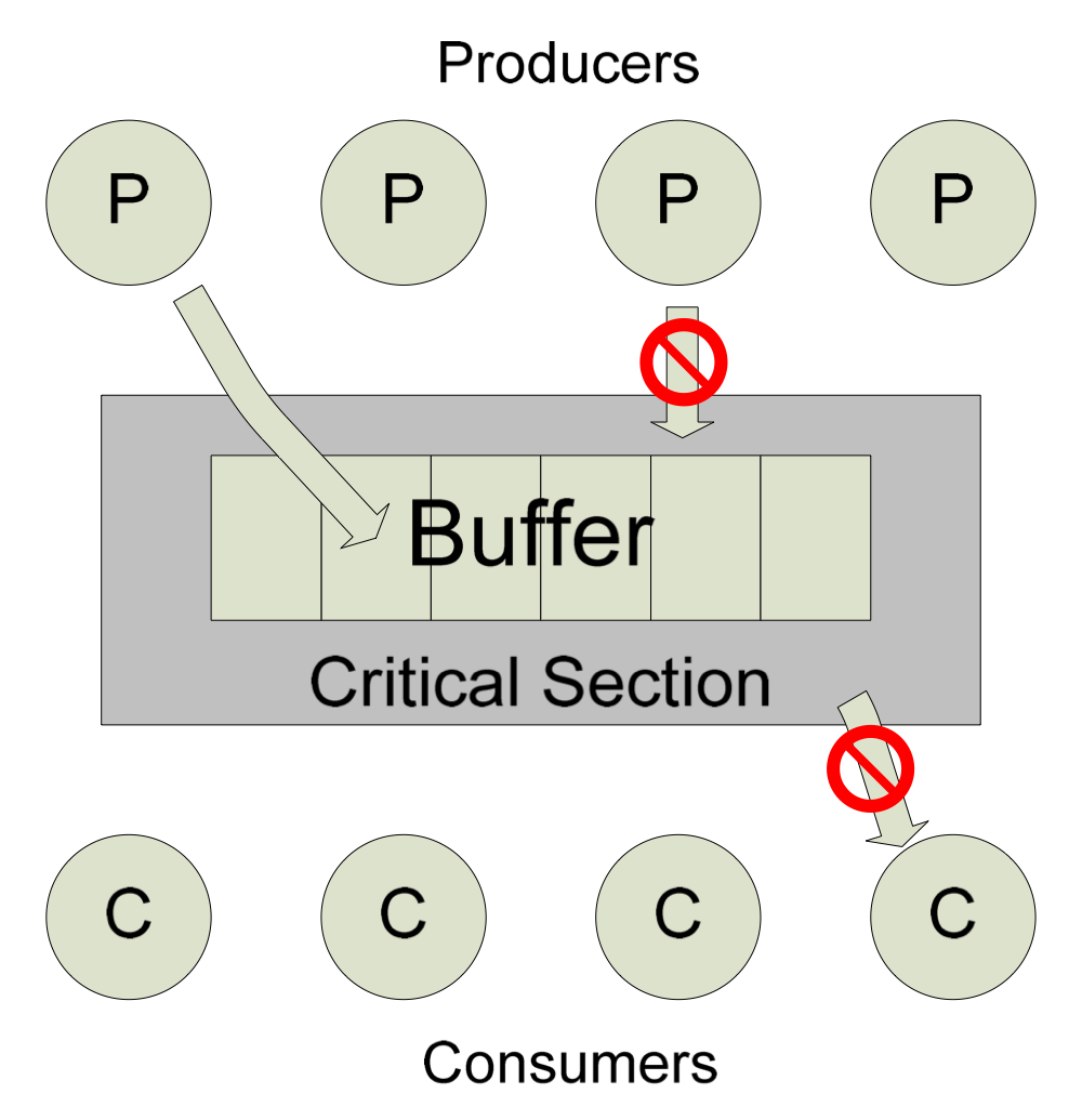 : N개의 Item을 삽입할 수 있는 Buffer가 있음. 여기에 여러 생산자와 소비자들이 접근함.