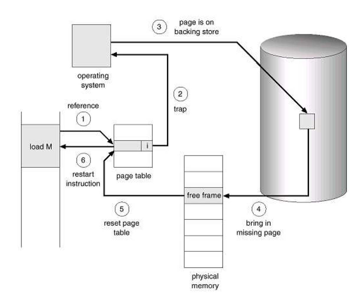 3) OS는 이 요청을 받아서 Page Fault Handler 실행되어(이때, 프로세스는 멈춰야 함.) Storage에 있는 Page를 찾아서 새로 할당한 Frame에 로딩함.