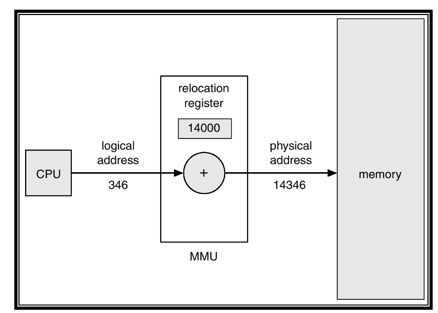 CPU가 프로세스의 VM에서 346번지를 접근하고자 함 -> MMU에게 찾아달라고 시작 주소(346번지)를 보내주면 MMU는 14000(상대적인 offset, 상대 주소)을 더해서 실제 물리메모리의 14346번지(절대 주소)를 가서 메모리 값을 찾아다가 CPU에게 넘겨줌.