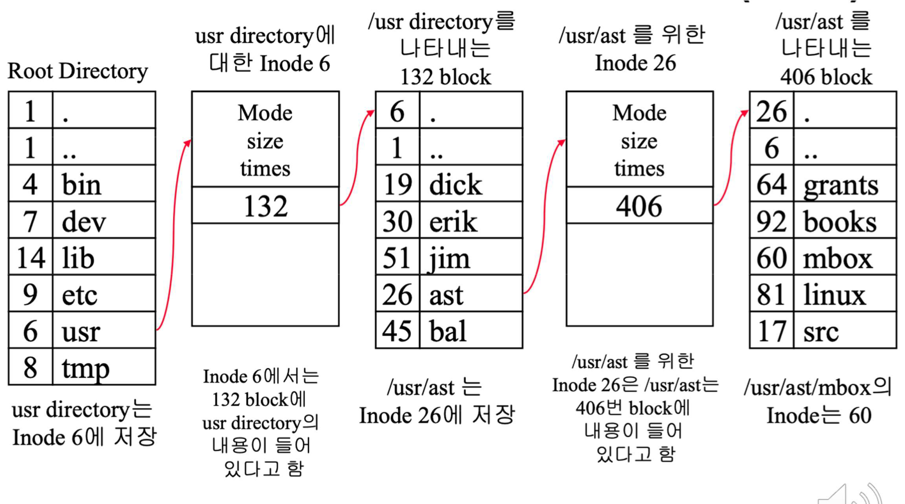 - Directory Entry가 File 이름+ I-node 번호로 이루어짐.