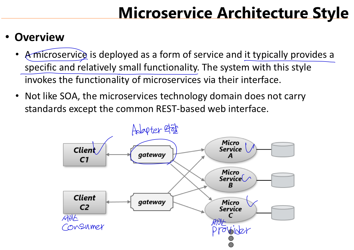 : 현재 가장 널리 쓰이는 스타일로, Client와 Micro Service의 인터페이스가 서로 다를 경우 이걸 맞춰주는 역할(adapter)을 하는 gateway가 함.