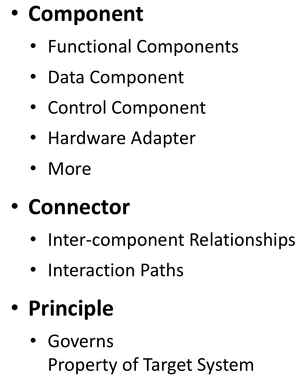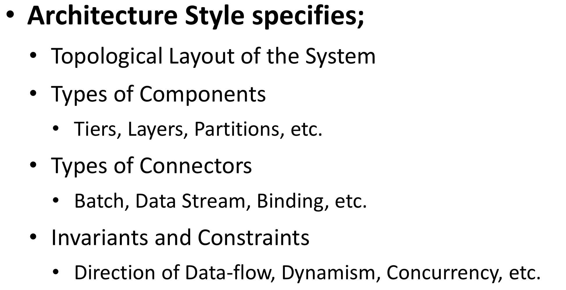 : Architecture는 그냥 Structure(구조물)이다. SW Architecture는 요소(Component), 관계(Inter-component Relationship), 원칙(아키텍쳐가 어떤 컴포넌트와 그 관계들로 구성되어져 있는지)들을 지닌 시스템의 기본 개념 혹은 특징임.