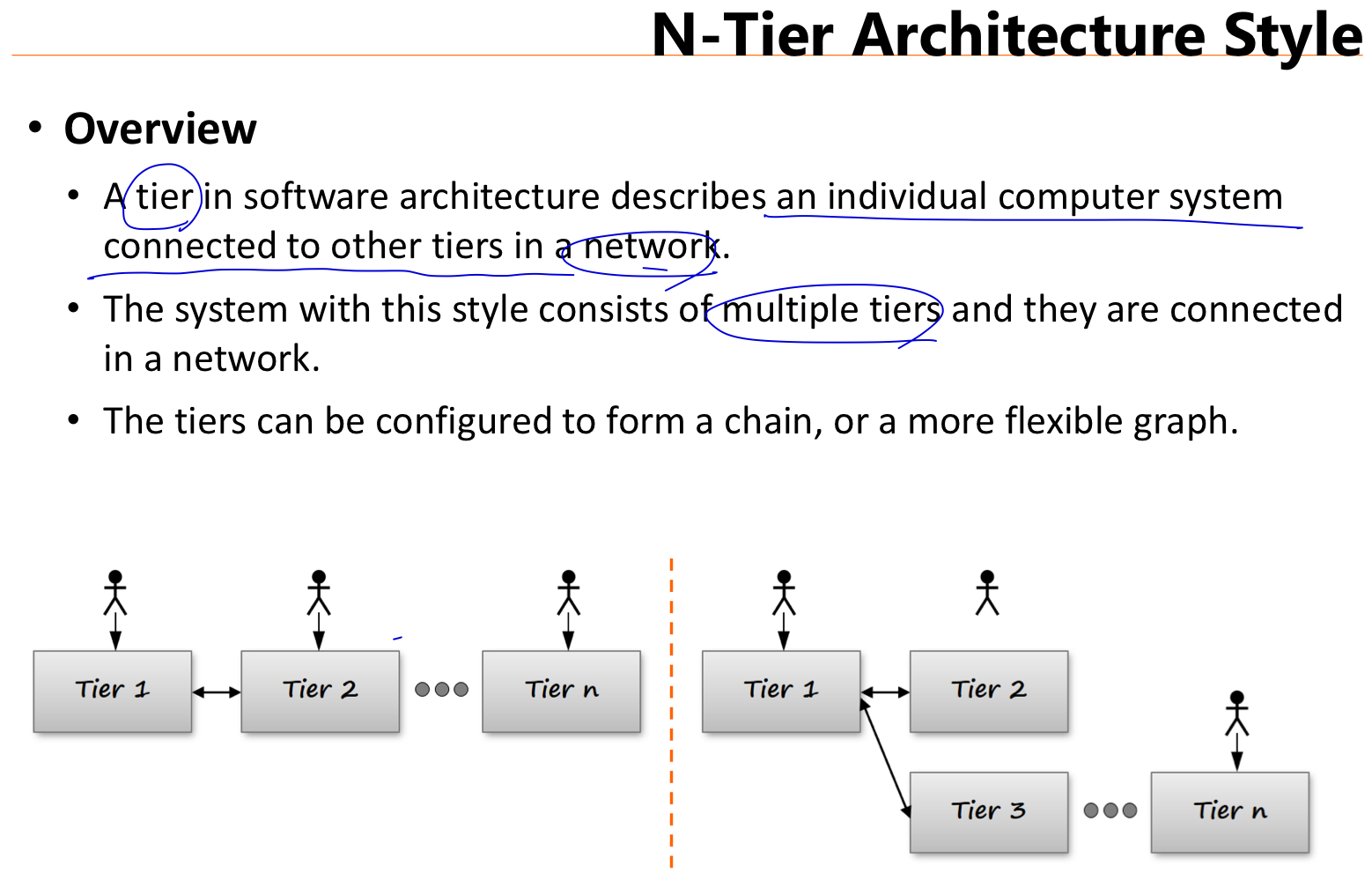 : 네트워크로 연결된 티어들의 시스템 형태.