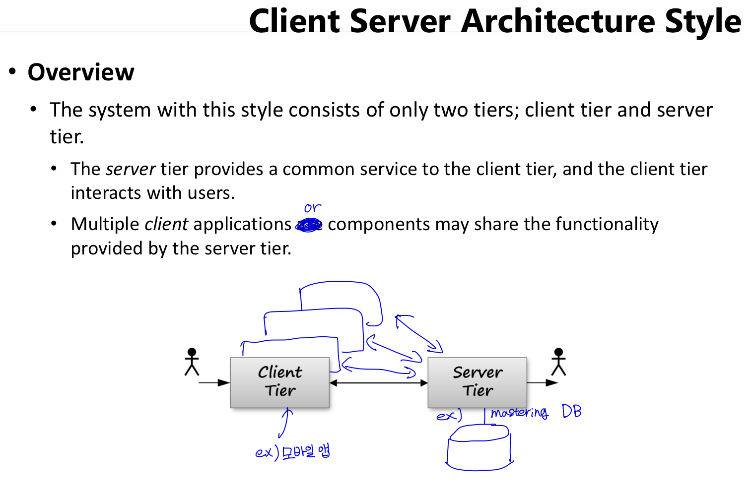 : 두개의 tier(Client tier, Server tier)로 구성되어 있는 시스템 형태.