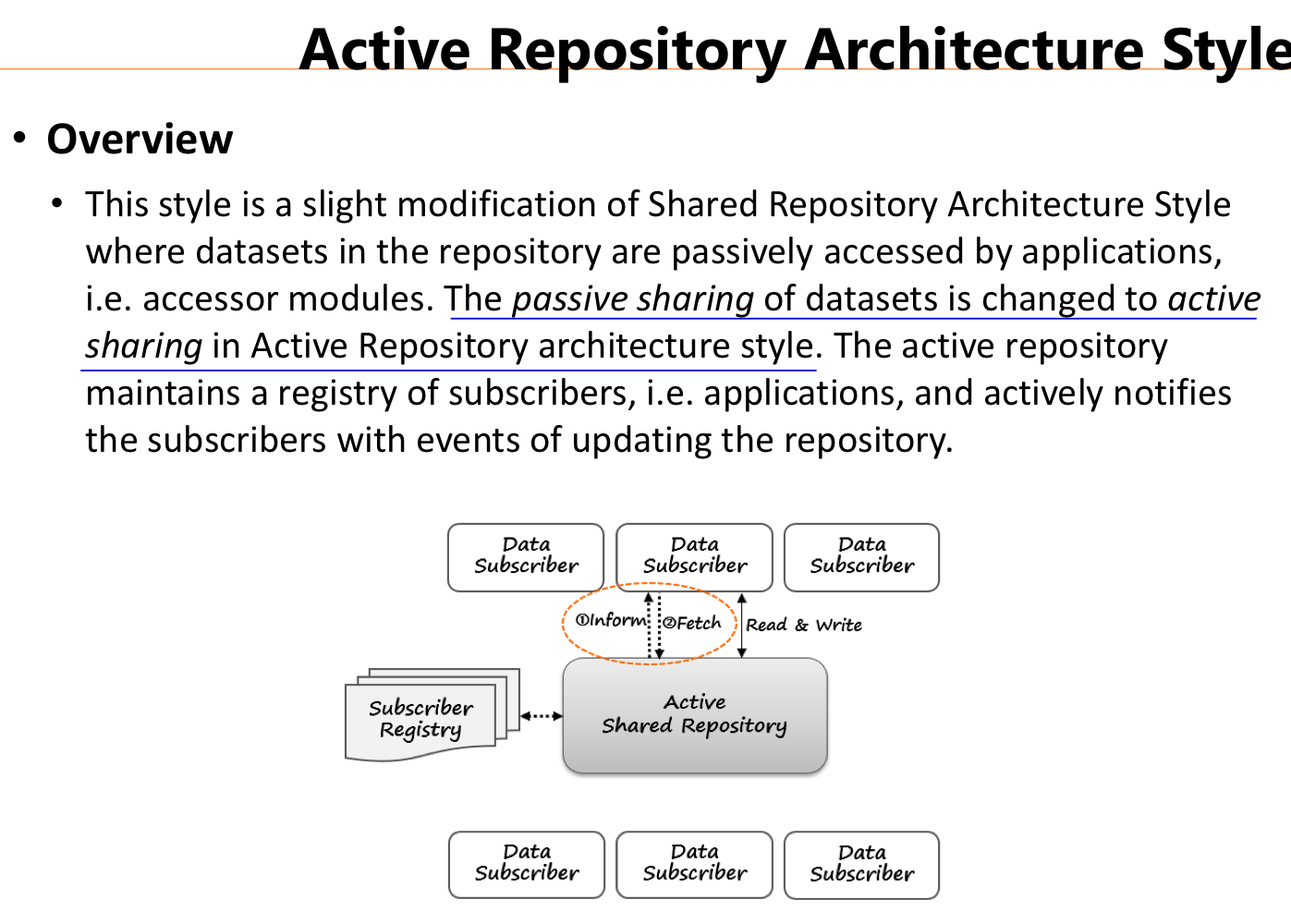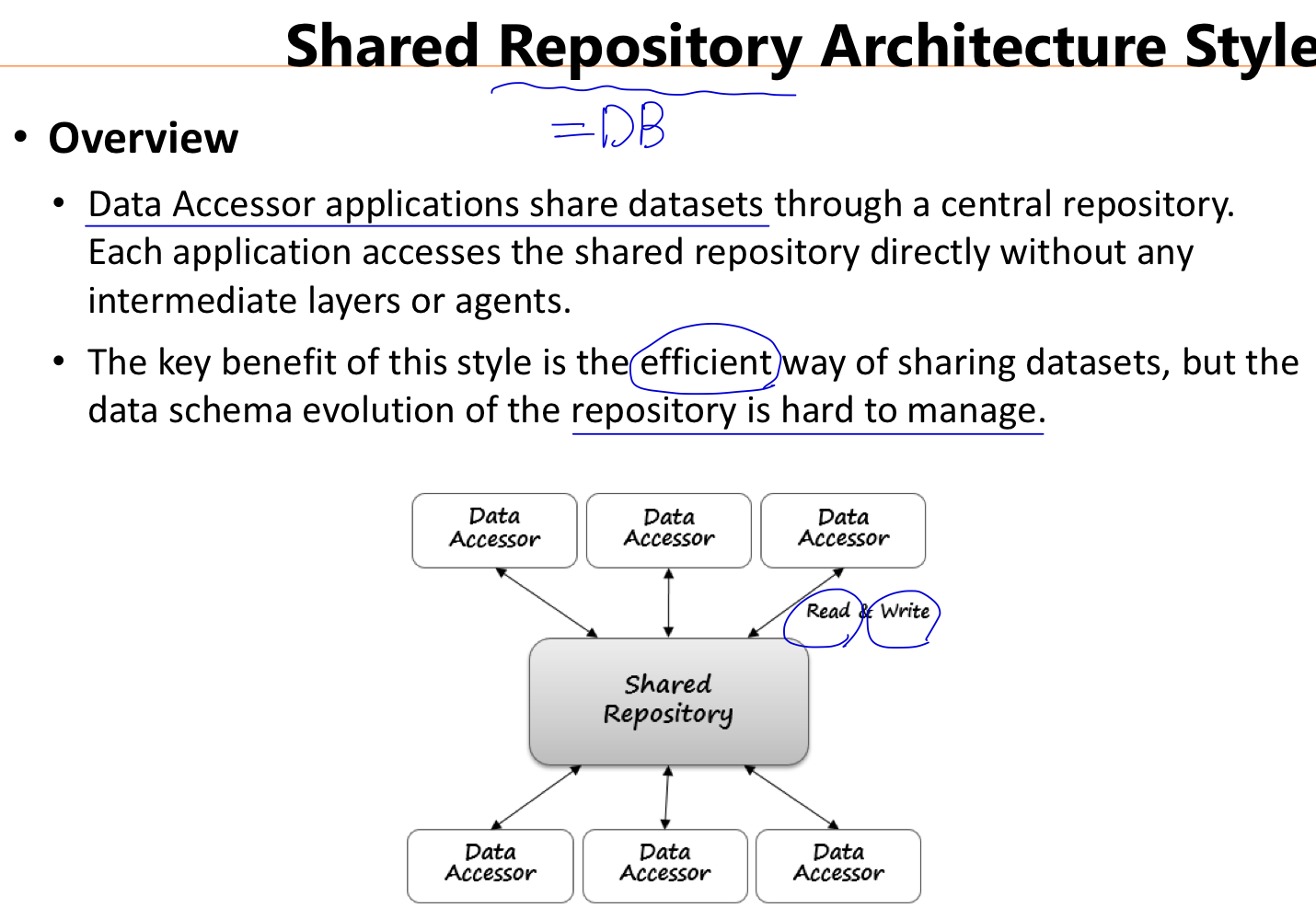 : 공유 레포지토리(DB)를 두고 각 Data Accessor가 dataset들을 Read&Write하며 공유하는 형태. 이때 서로 공유하는 것은 효율적이긴 하나 업데이트된 값을 가져오려면 수동 접근을 해야 함. 이런건 좀 비효율적임.