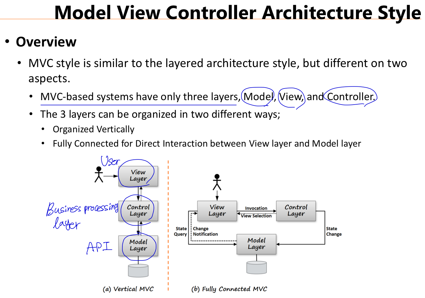 : Layered와 비슷한데 3가지 Layer를 가짐.(Model, Controller, View)