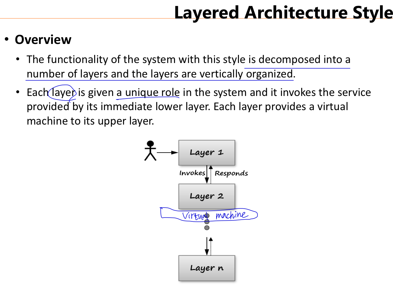 : 각자 역할이 정해진 Layer들이 수직으로 구성된 형태로, 아래의 Layer는 위의 Layer에 Virtual Machine을 제공하기에 더 밑의 Layer 내용을 알 필요가 없음.
