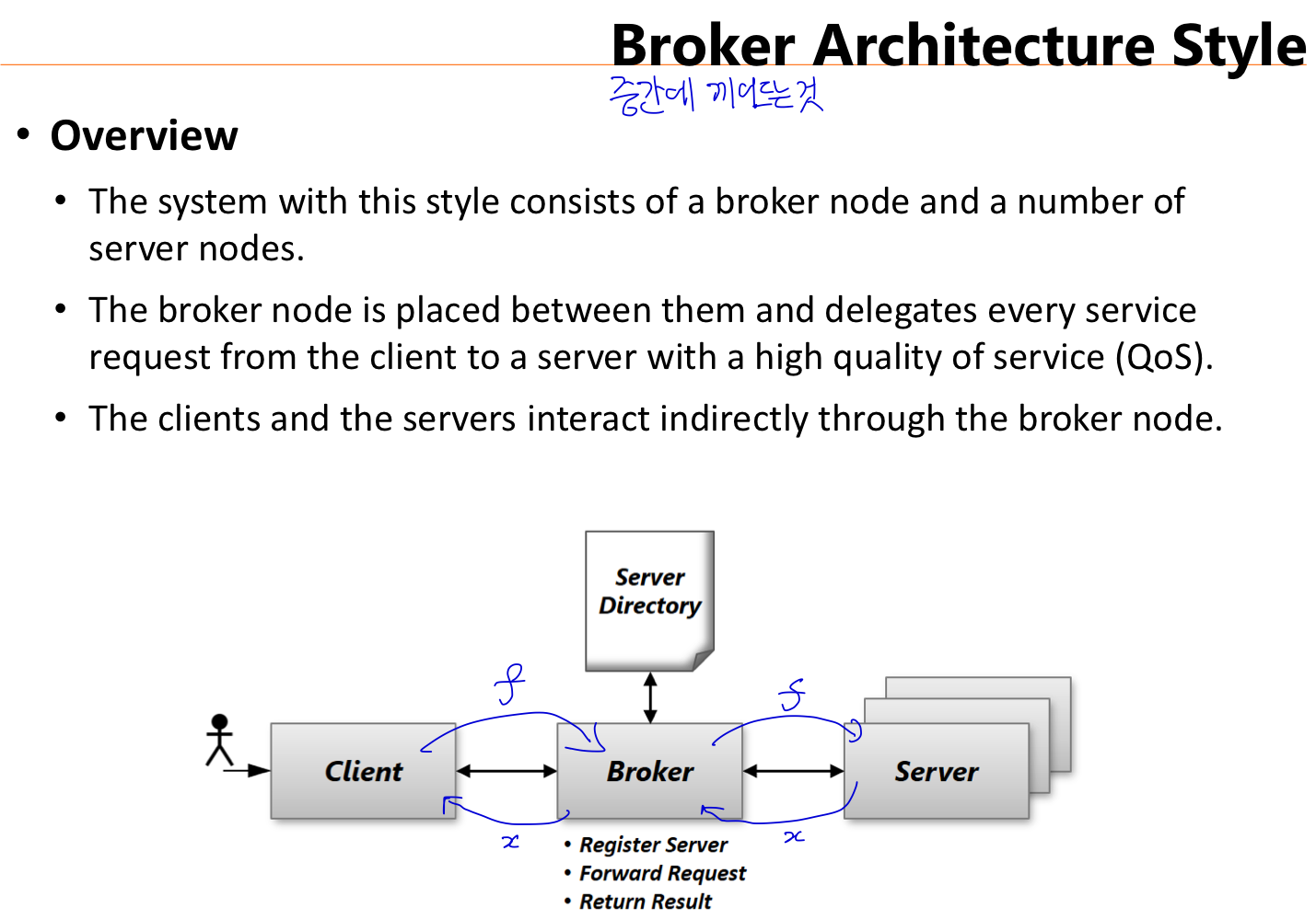 : Client node와 여러 Server node들 사이에 Broker node가 끼어있는 것으로 높은 서비스 신뢰도와 QoS를 보장함. 이들 사이에 Broker node가 있기에 client와 server는 직접 상호작용하지 않음.