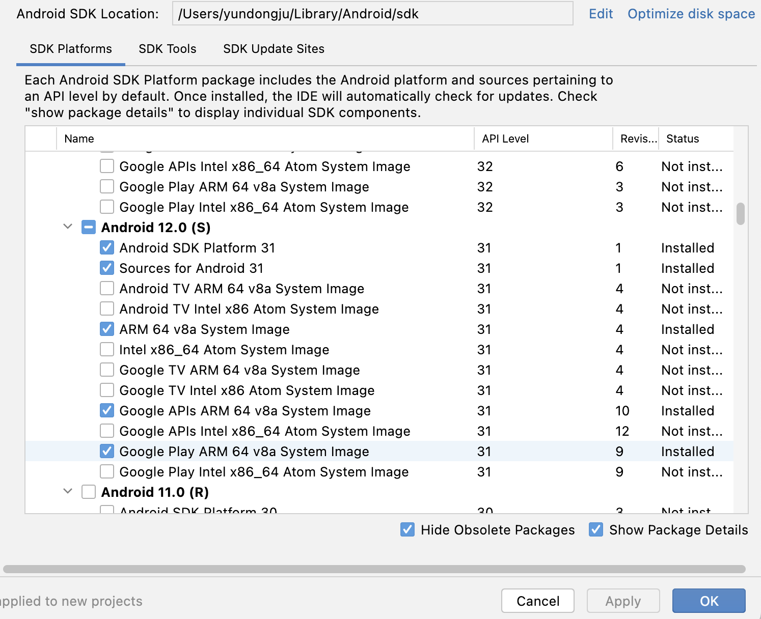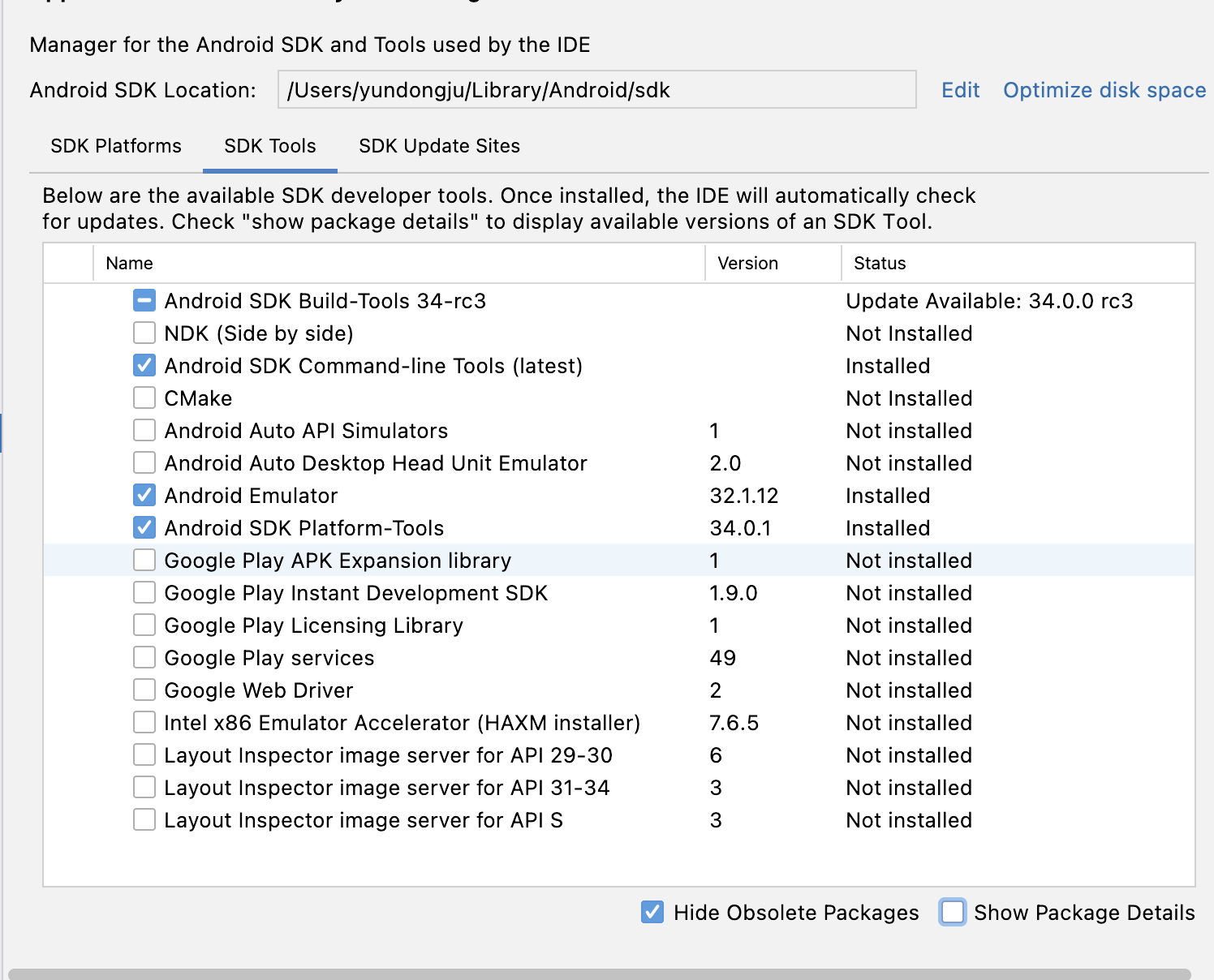 export ANDROID_HOME=/Users/yundongju/Library/Android/sdk //<--이건 본인 Android Studio에서 SDK Manager 들어가면 다음 사진과 같은게 있다. 그거 가져온다.