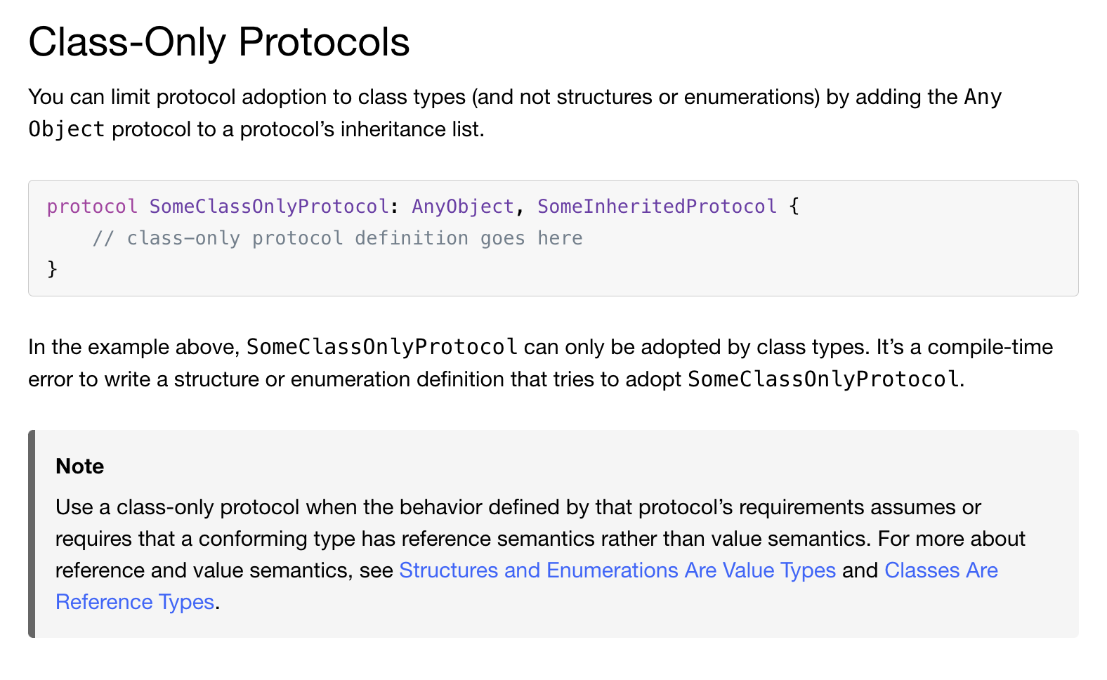 위처럼 AnyObject로 두면은 오직 클래스들만 이 프로토콜을 채택할 수 있습니다. 예전에는 사실 다음과 같이 class를 써도 무방했다고 합니다. 꽤 이 부분에 대한 논쟁이 있었다고 아래 블로그를 뒤적뒤적 하다가 알게되었습니다.ㅎㅎㅎ