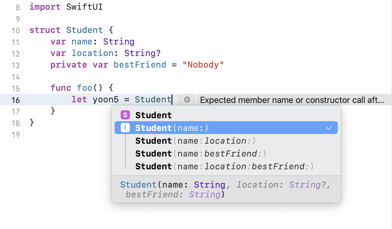 let yoon2 = Student(name: "Xerath Yoon", location: "Pohang", bestFriend: "Somebody")