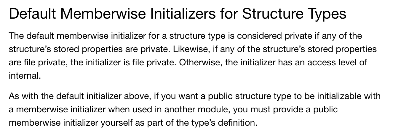 알고보니 private 속성이 하나라도 있으면 Memberwise Initializer도 private으로 설정이 된다고 하더군요...!