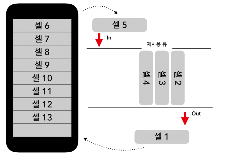 위 그림을 참고하면 셀 5~13이 보여지고 있다가 위로 스크롤을 올려서 셀5가 빠지고 셀1이 추가되는 상황입니다.
