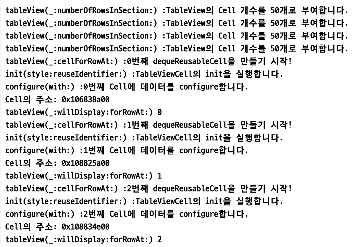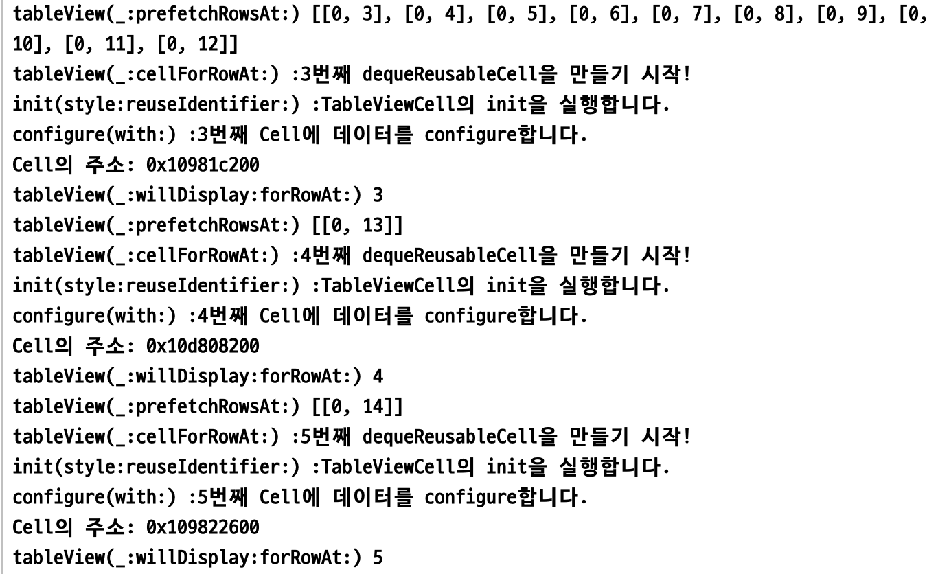 우선 'N번째 dequeReusableCell을 만들기 시작!'가 출력이 되구요.