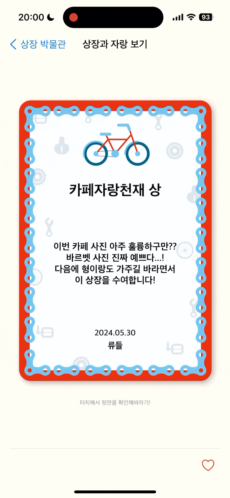 위 영상은 따로 카드 flip 뷰로 카드를 뒤집는 기능 뷰를 구현해서 해당 상장의 내용을 자랑과 함께 볼 수 있도록 했습니다.