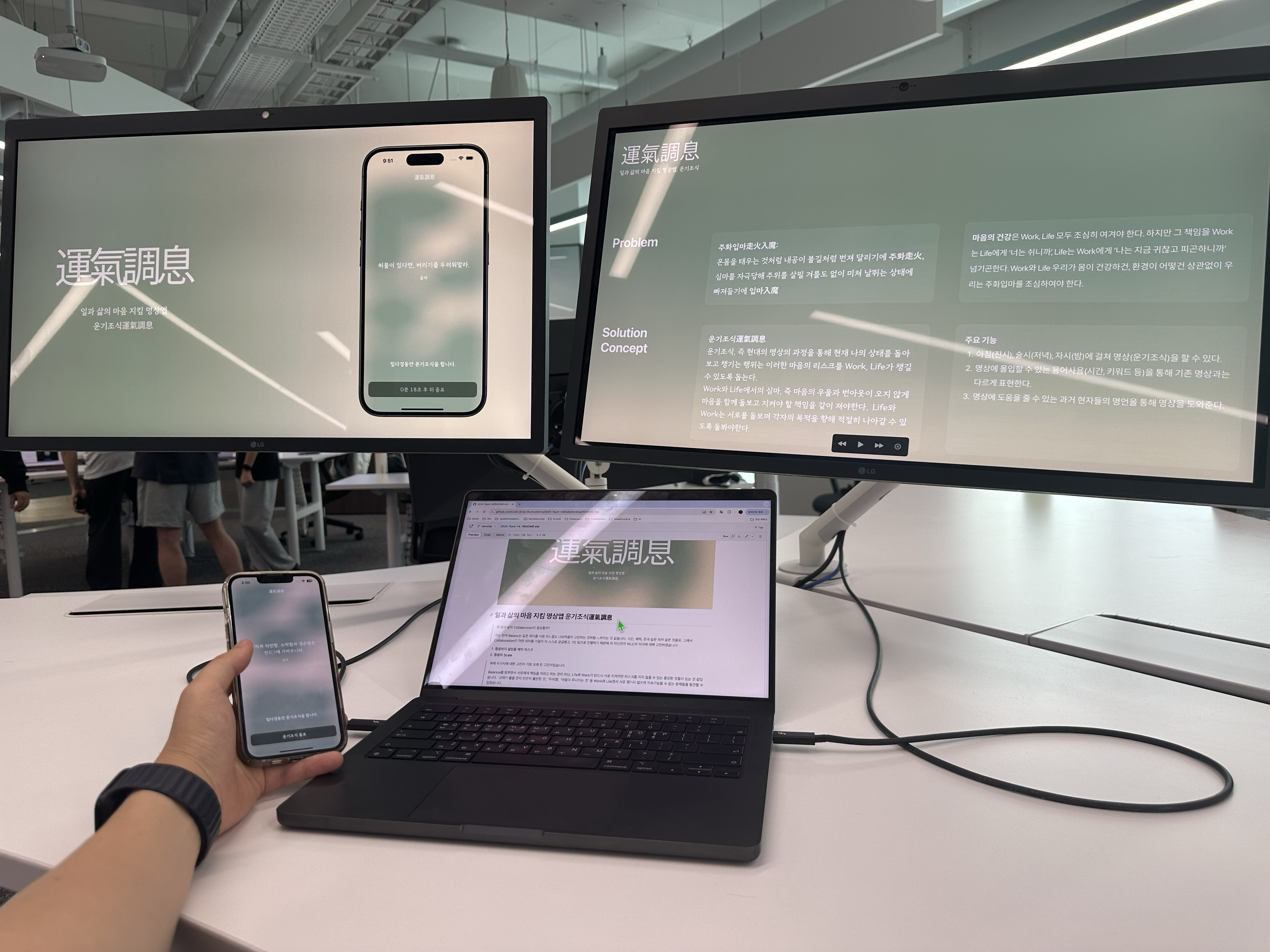 '주화입마' 라는 현대의 개념으로는 '번아웃'의 상태를 개선하기 위한 앱으로, 운기조식이라는 명상법을 적용했습니다.