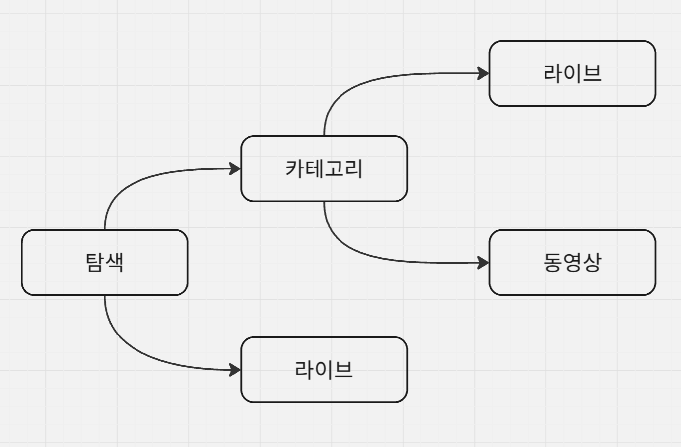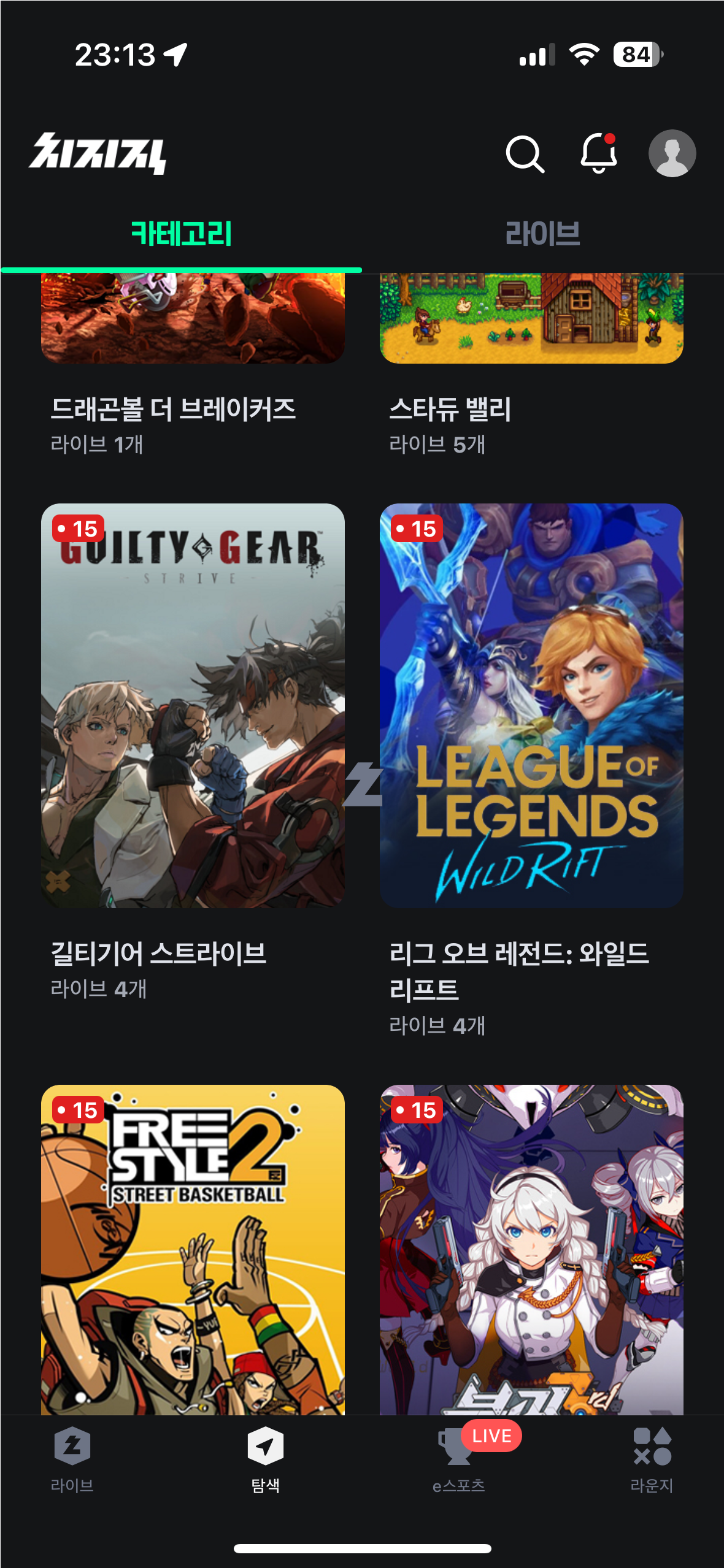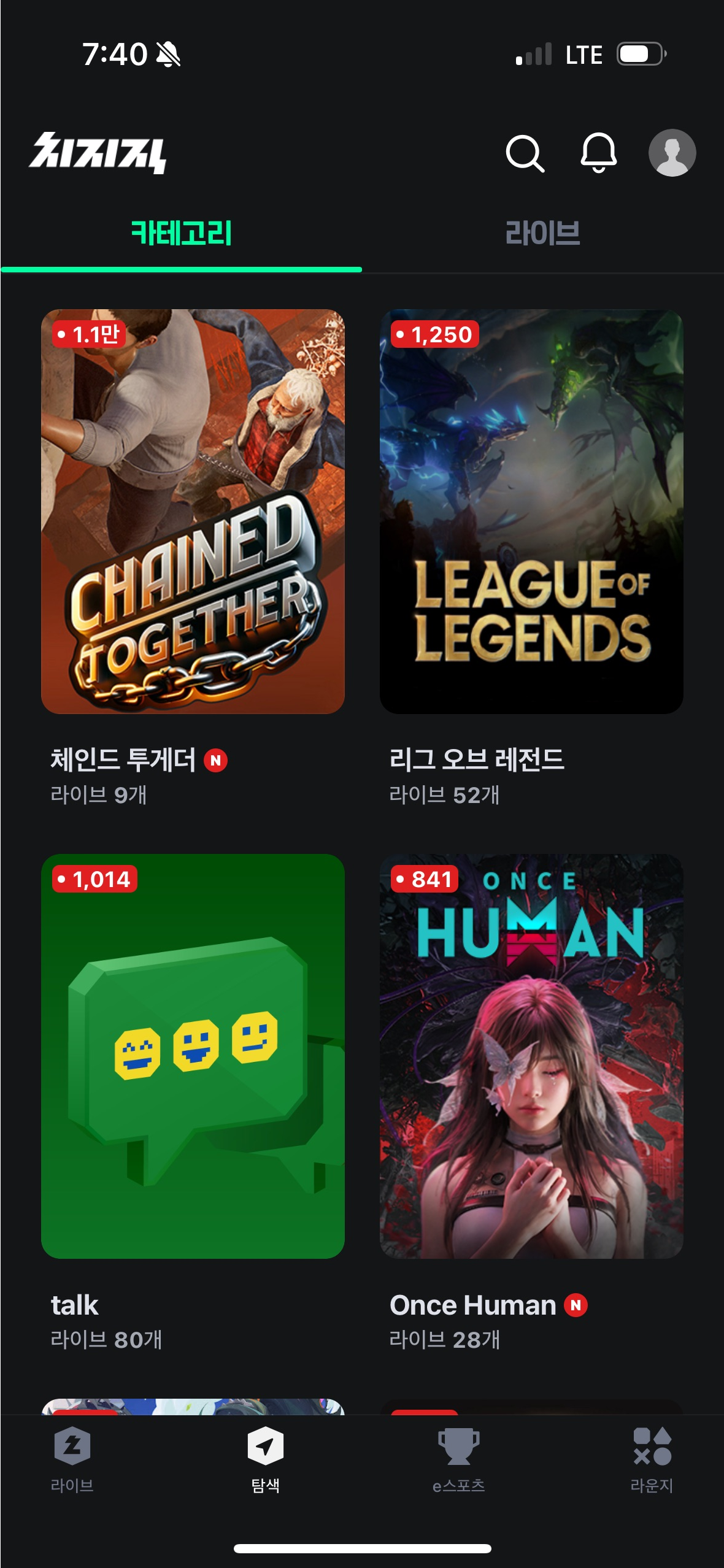 '탐색' 탭에는 '카테고리'와 '라이브'란 탭으로 나뉘는데
