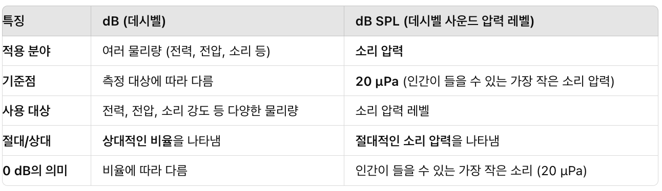 그럼 지피티 형님게 여쭤본 dB과 dB SPL을 비교한 표는 다음과 같습니다.