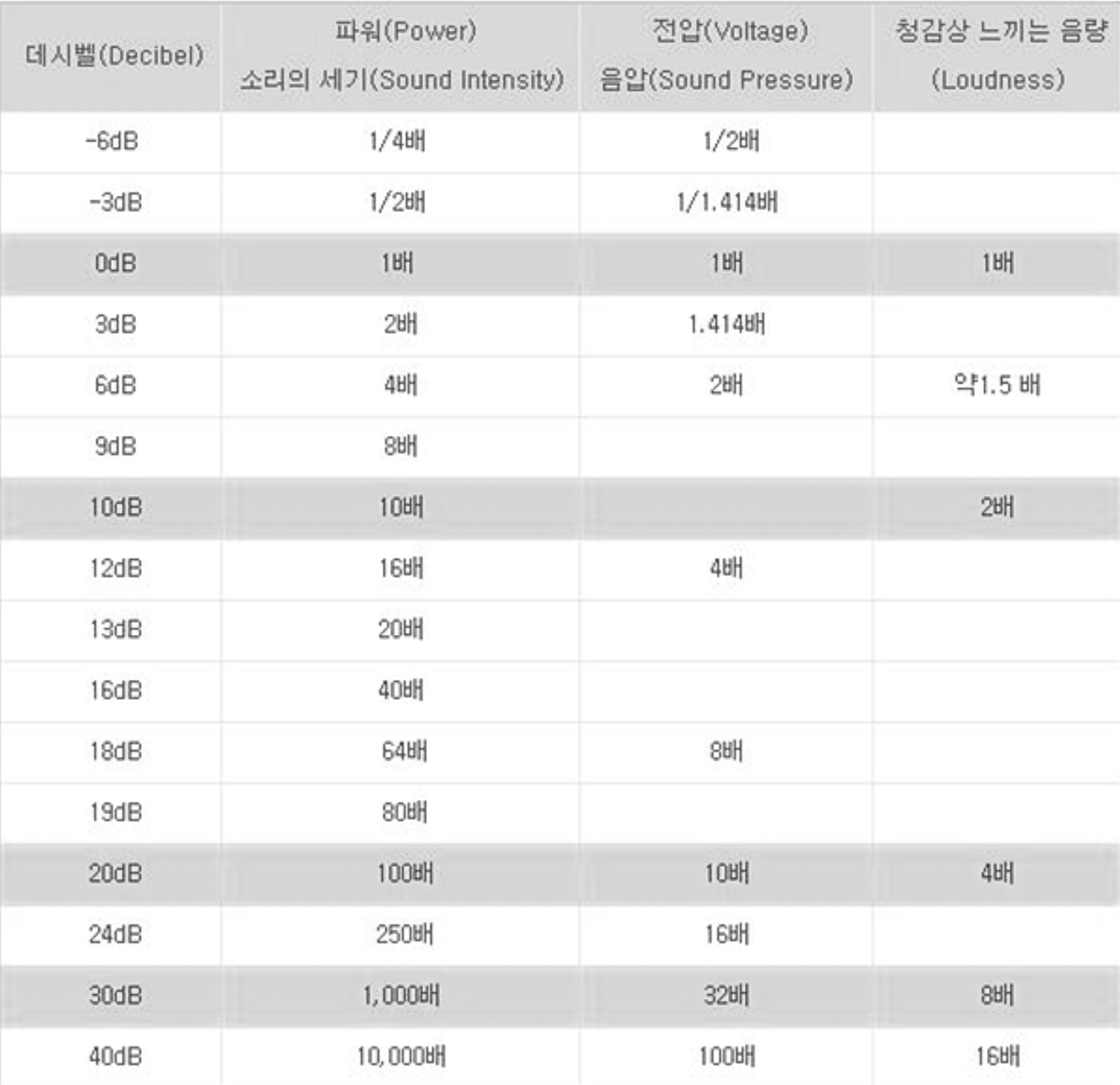 이 표를 보시면 10dB은 0dB의 2배, 20dB은 10dB의 2배, 30dB은 20dB의 2배