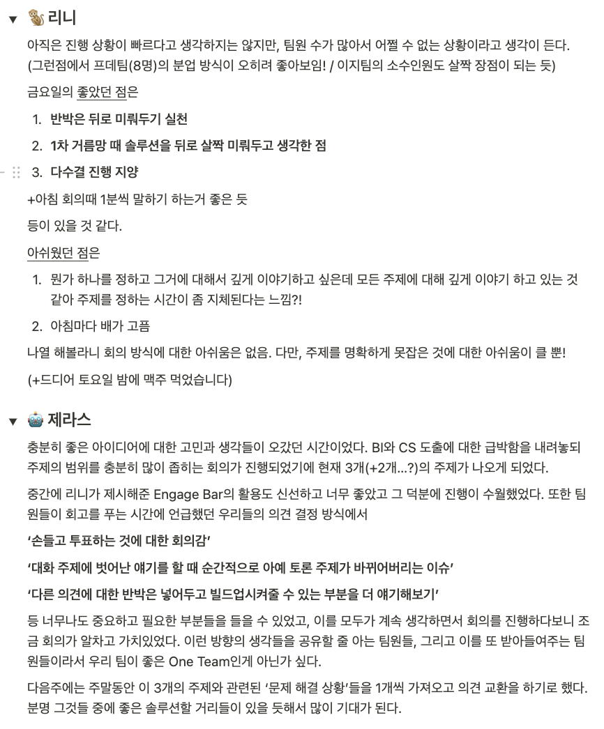 이렇게 회고들을 진행하면서 더 좋아질 부분들을 공유하면서