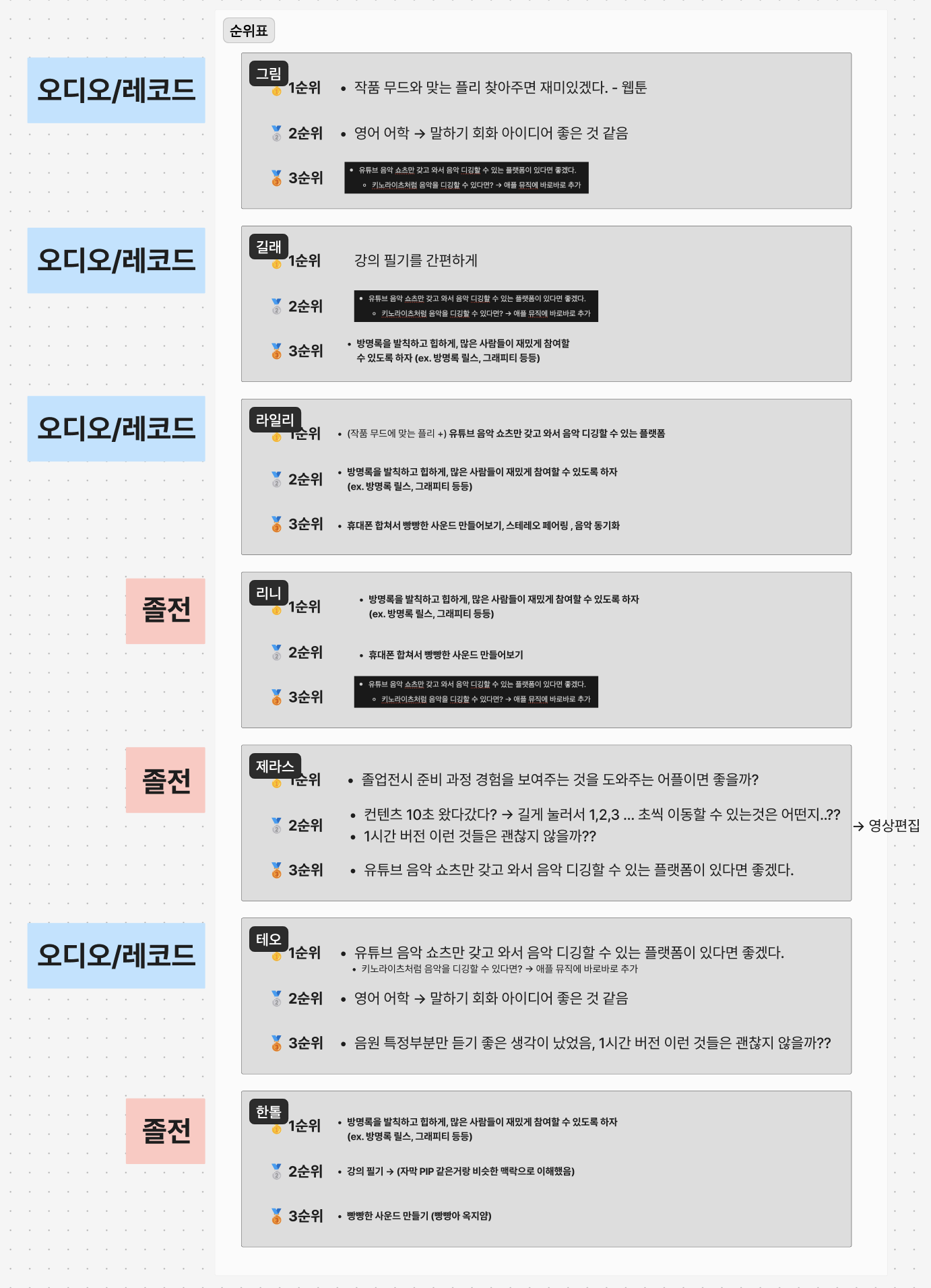 이렇게 여러 아이디어들을 나열해둔 후 가장 문제 해결 상황이 잘 보이거나 Engage가 잘 되는 주제를 1~3순위를 메겨보았습니다.