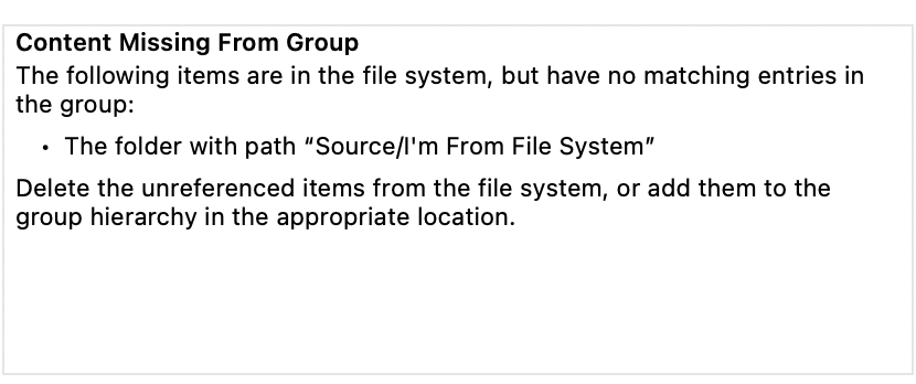 이렇게 파일 시스템에 'I'm From File System'이란 폴더를 만들어도 Xcode에서는 보이지 않습니다.