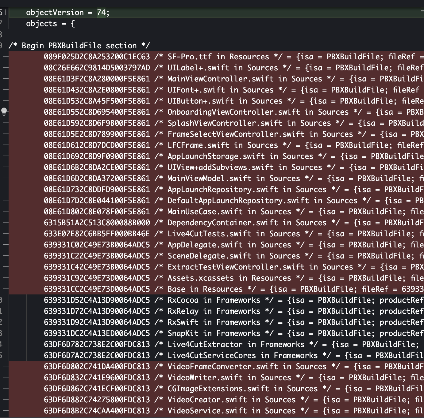PBXBuildfile section의 대부분이 제거되는 모습입니다.